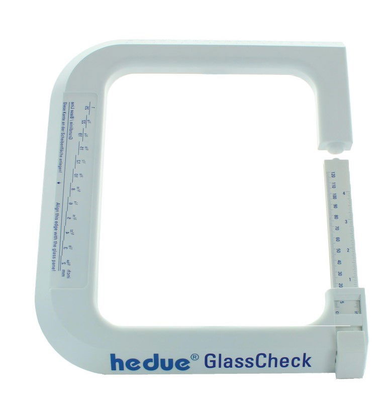 Az üveg mérő alkalmas beépített állapotú ablaküvegek vagy szigetelőüvegek vastagságának mérésére. Akár 110 mm-es vastagság is mérhető vele. Továbbá egy optikai üvegvastagság mérő is található az eszközön. Ezáltal lehetővé válik, hogy az ütközőfelületet az alapvonallal az üvegnek helyezve az egyes üveg-táblák vastagságát leolvassuk. üvegvastagság mérő üvegvastagság.