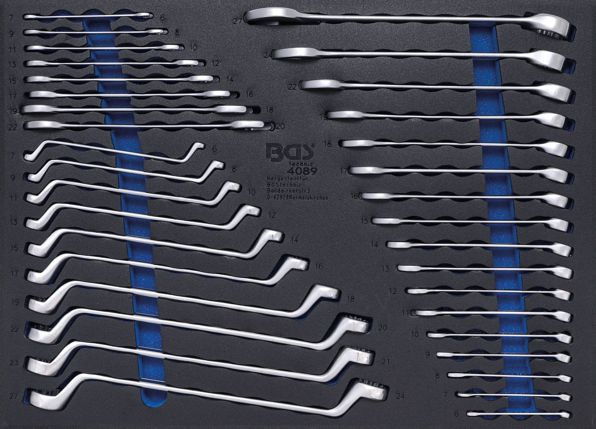10 db csillagkulcs, mélyen hajlított: 6 x 7 - 8 x 9 - 10 x 11 - 12 x 13 - 14 x 15 - 16 x 17 - 18 x 19 - 20 x 22 - 21 x 23 - 24 x 27 mm